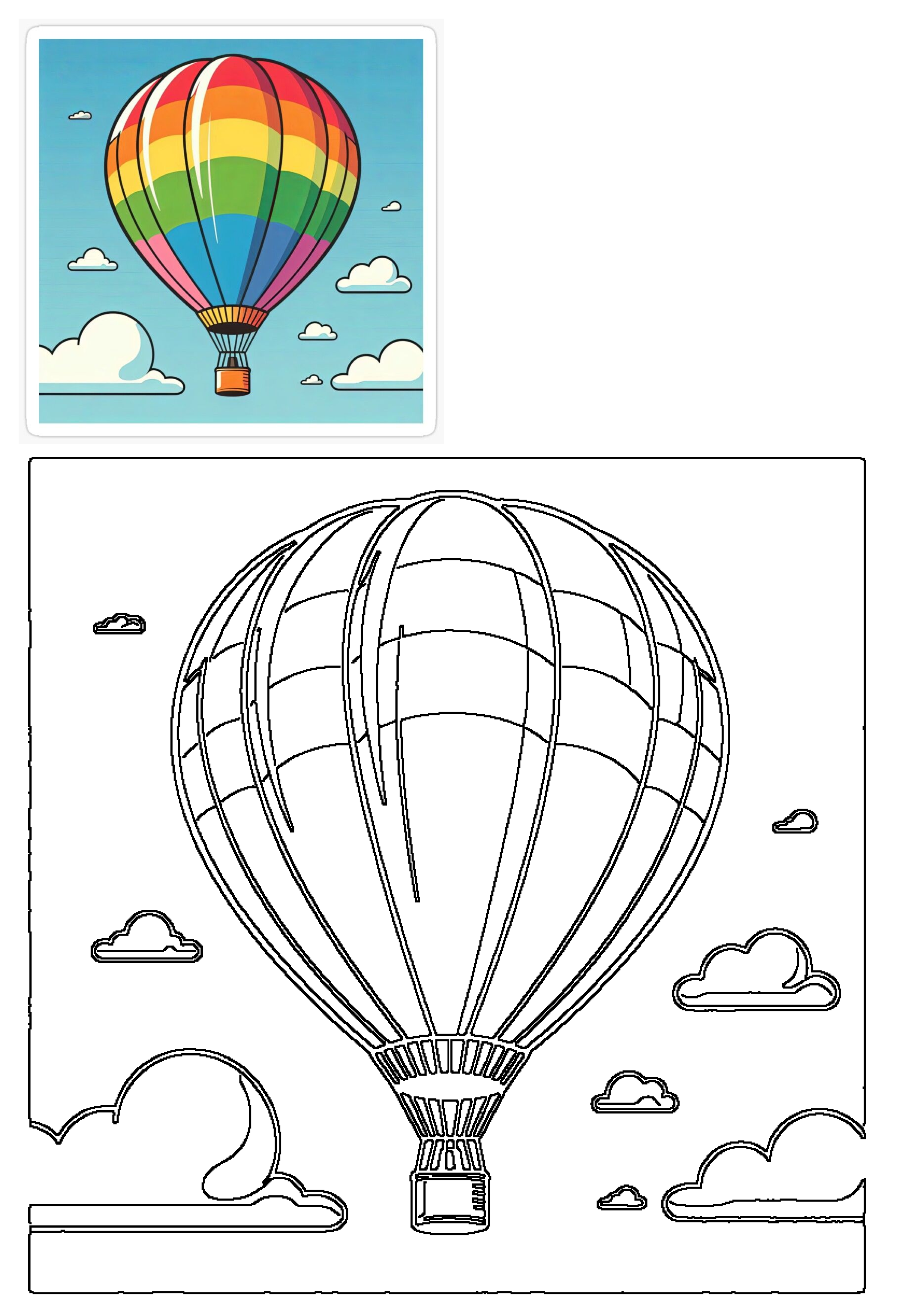 Free printable Rainbow Hot Air Balloon Flying Clouds Blue Sky coloring page for kids of all ages. You can print or download this high-quality A4 outline to color at home. Perfect for educational activities and developing creativity.